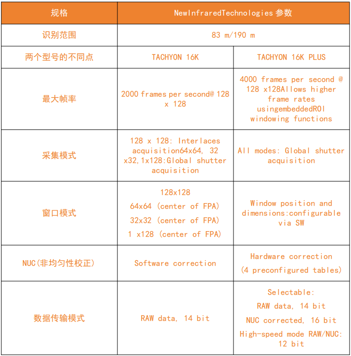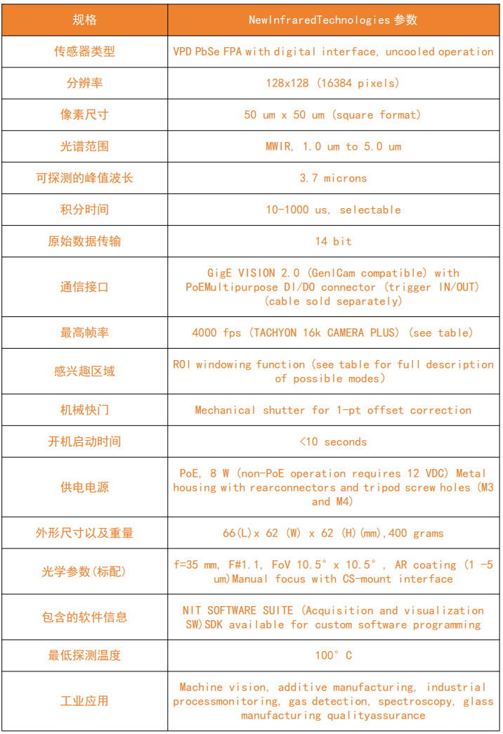 New Infrared Technologies 公司(NIT)研发的高帧率红外相机的波段涵盖1-5 微米,是一款中波红外相机,同时相机帧数超过 4000fps 每秒,成像阵列 128×128,像元尺寸 50 微米,视场范围 10.5°×10.5°,在相机的高性能的可靠加持下,可实现智能化的工业制造,提高良品率。